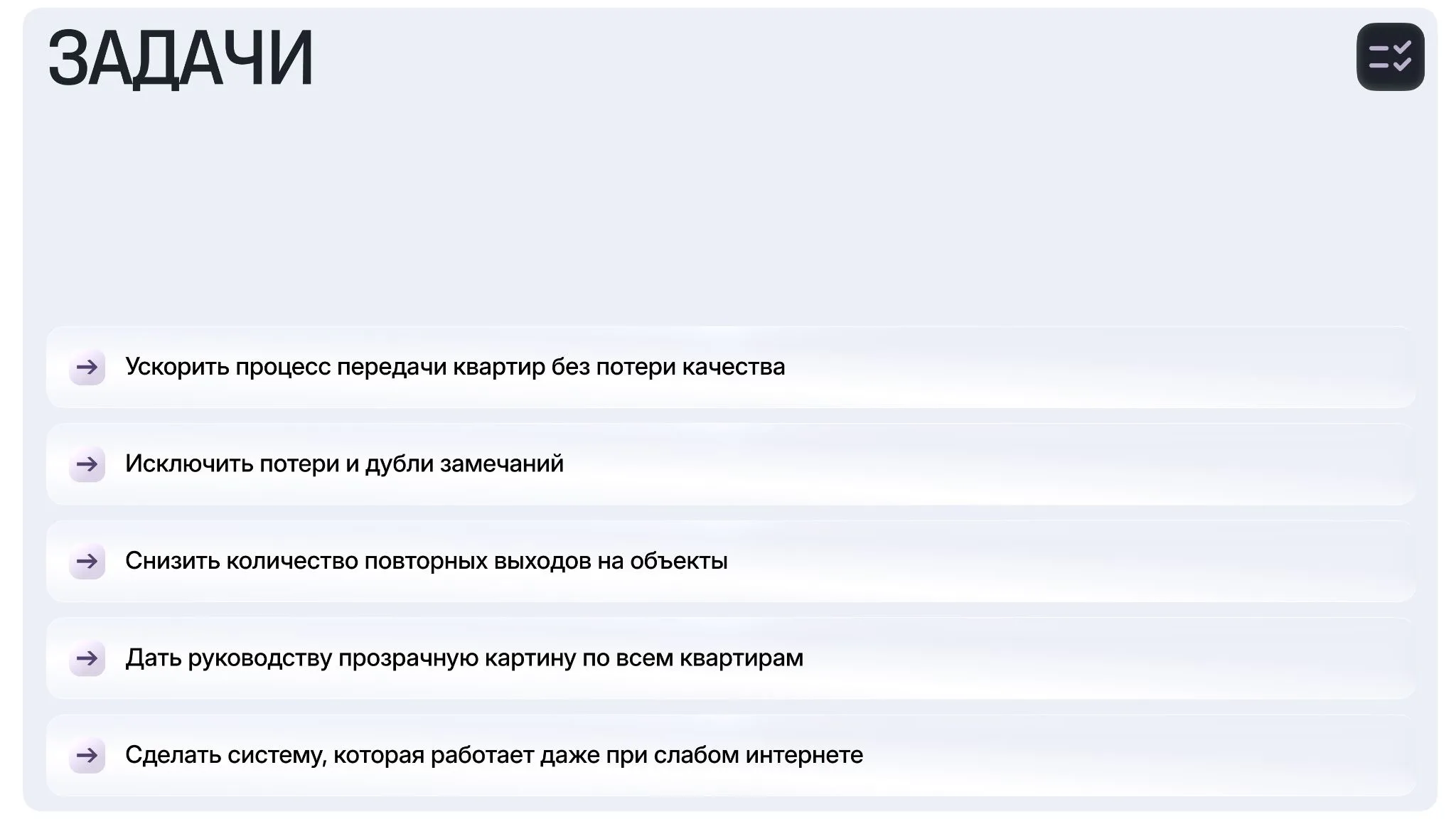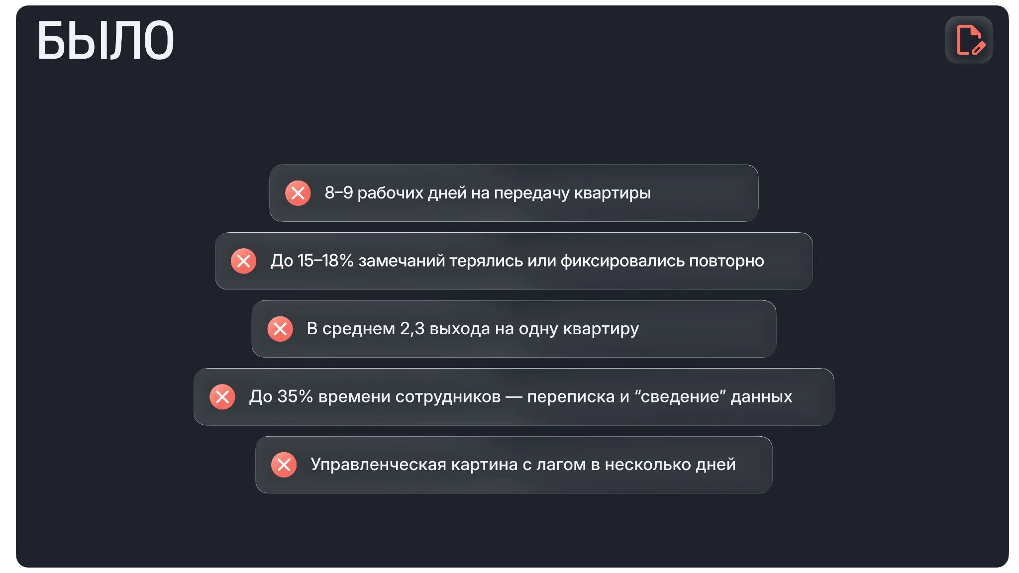 «Раньше мы постоянно держали в голове десятки мелких задач. Сейчас система делает это за нас. Мы видим каждую квартиру, каждое замечание и каждый статус. Работа стала спокойнее и предсказуемее».