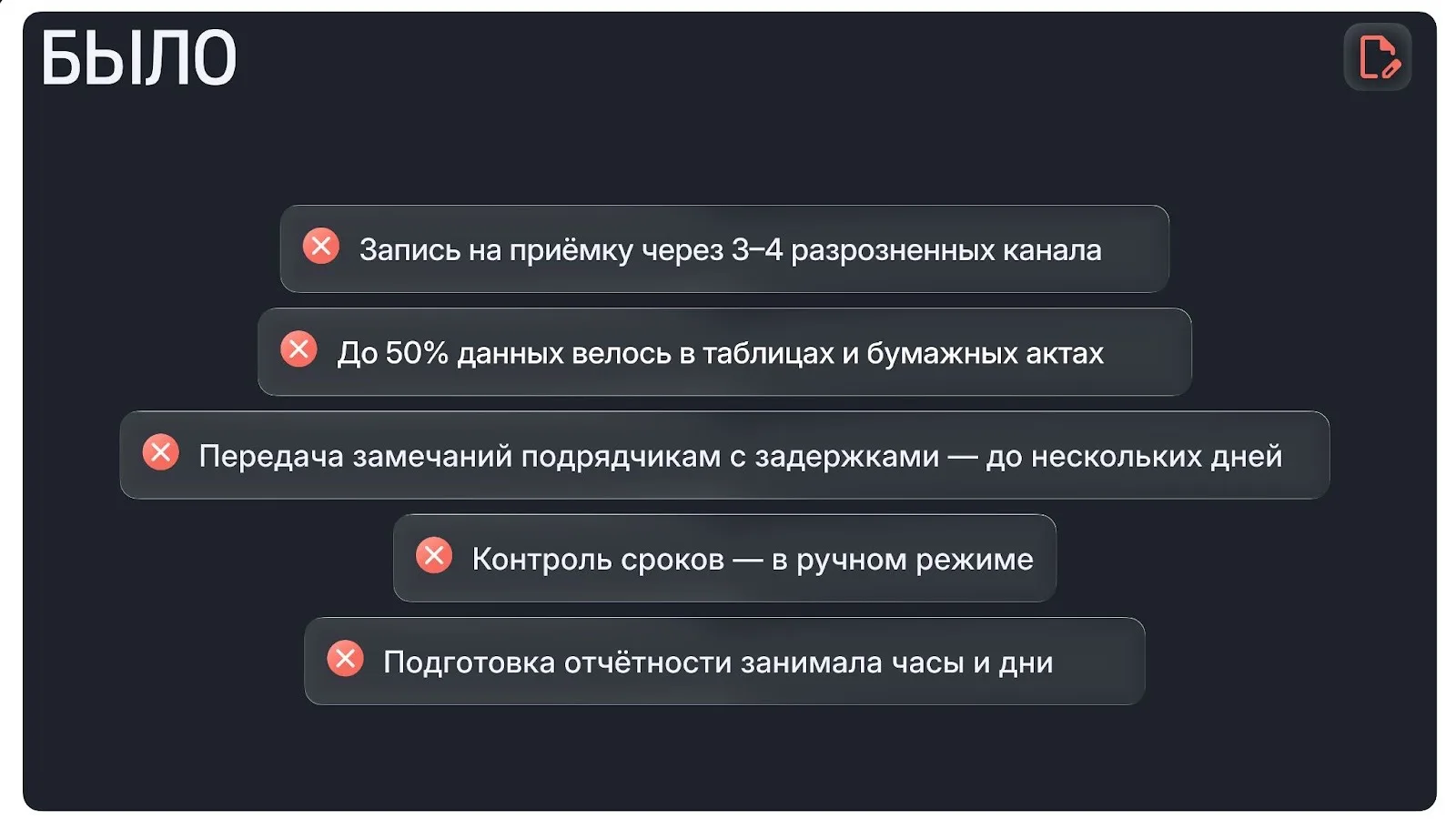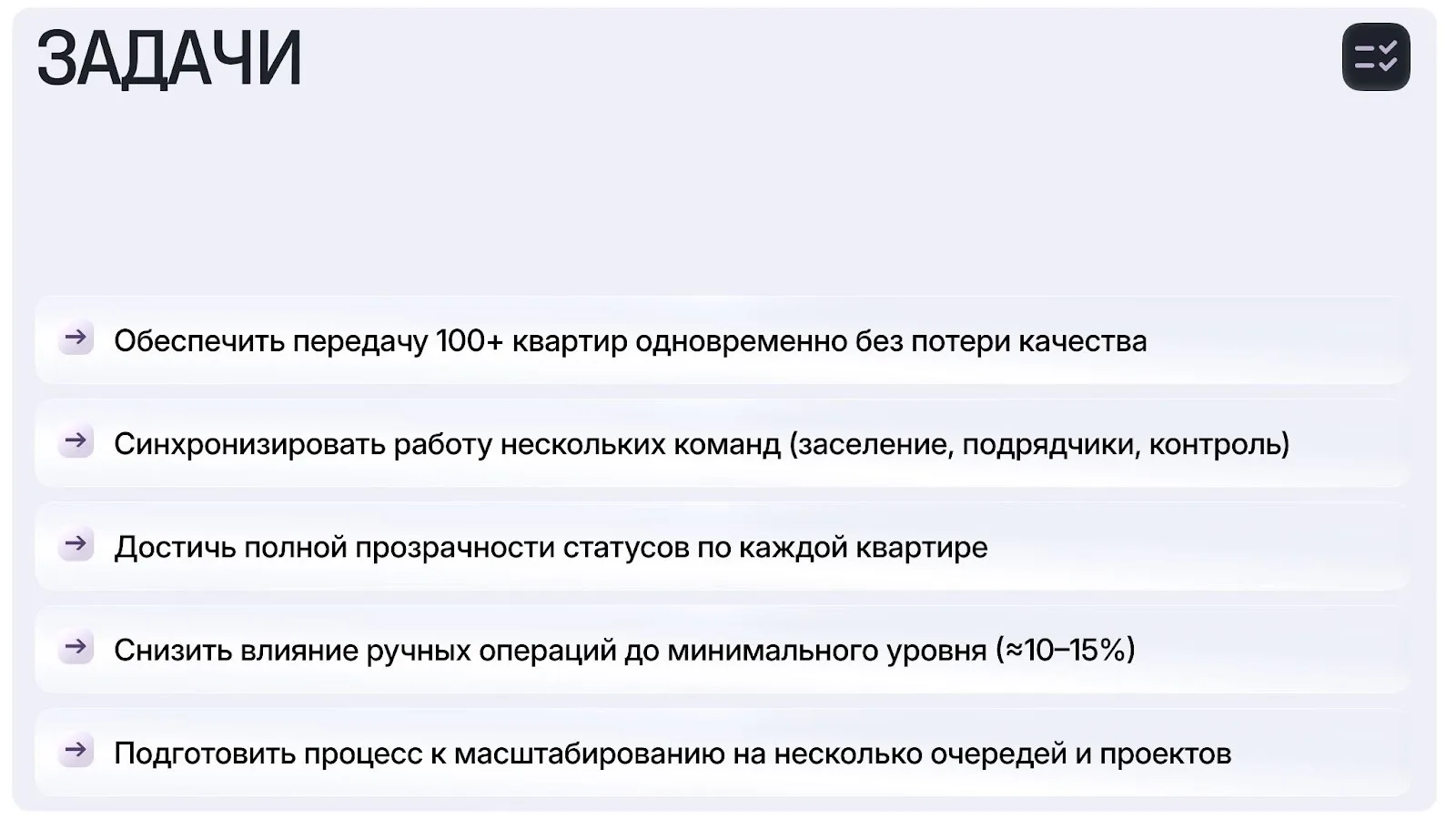 Процесс держался на людях, опыте и постоянной ручной координации. Любая нестандартная ситуация требовала вмешательства руководителей и замедляла передачу квартир.