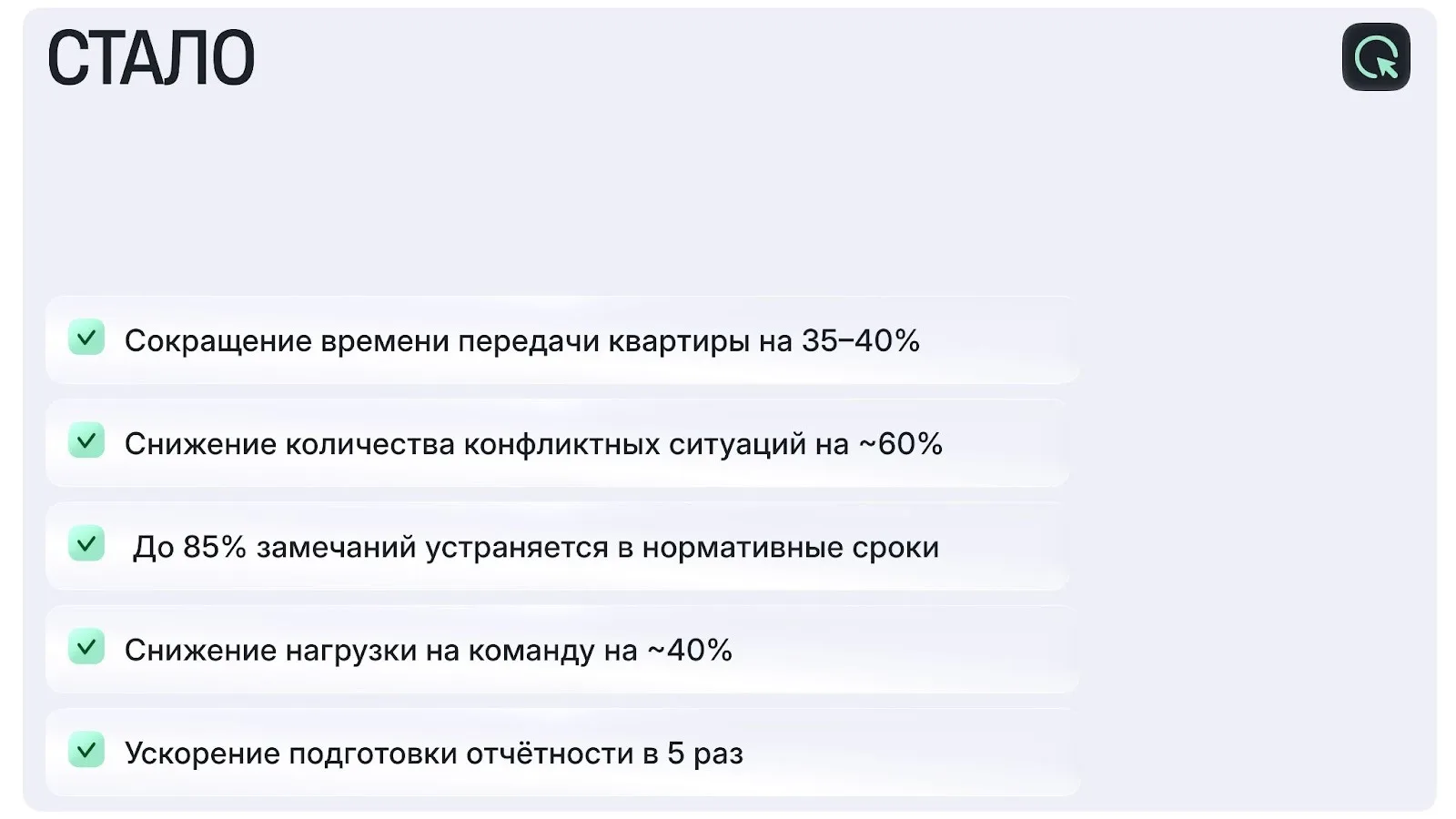 - Количество конфликтных ситуаций на приёмке снижено на 60%.