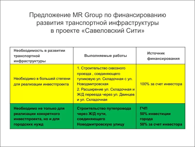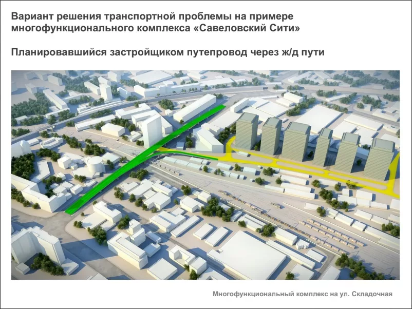 «У нас есть проект “Савеловский Сити”, его строительство давно завершено. Но когда мы начинали его, мы предлагали городу построить путепровод (на схеме обозначен синим и зеленым цветом). А желтым цветом, соответственно, обозначена уличная дорожная сеть внутриквартальная, которую мы собирались строить за свой счет. Но построить за свой счет путепровод мы не могли себе позволить, и поэтому предложили городу вот такую форму государственно-частного партнерства, когда 50 процентов инвестиций вкладывает город и 50 процентов за счет инвестора. Наша финансовая модель вполне это выдерживала. Но это предложение принято не было, поскольку законодательство ни тогда, ни сейчас не предусматривало такой формы государственно-частного партнерства».
