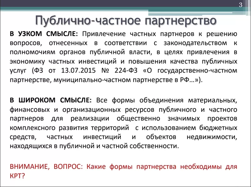 По его словам, для комплексного развития территории необходимо широкое понимание это термина, а именно – все формы объединения ресурсов для того, чтобы добиться синергетического эффекта. Во всяком случае есть вопрос, на который надо ответить: «Какие формы партнерства необходимы для КРТ?», считает эксперт.