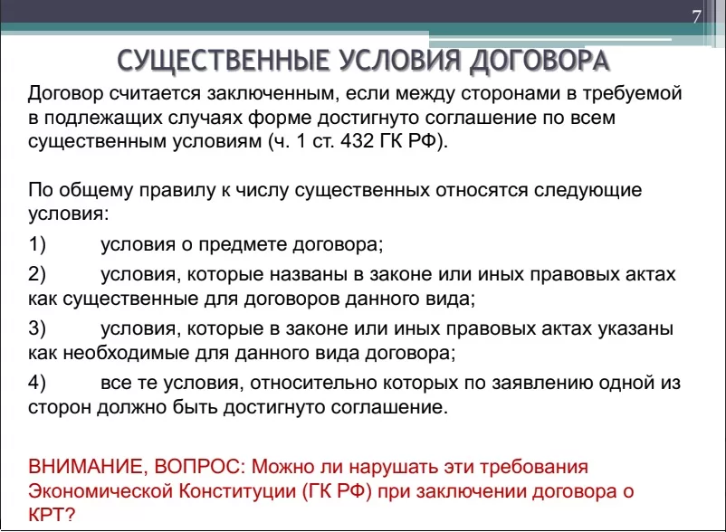 Рассказывая о существующих правовых вопросах в части регулирования КРТ, эксперт напомнил также о существенных условиях договора. Согласно Гражданскому кодексу РФ, договор считается заключенным только в том случае, если между сторонами в требуемой форме достигнуто соглашение по всем существенным условиям, начиная с предмета и заканчивая теми условиями, которые должны быть достигнуты по заявлению одной из сторон.