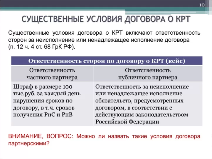 Еще один момент – вопрос об ответственности сторон по договору о КРТ. А это тоже обязательные условия договора, то есть должна быть предусмотрена ответственность.