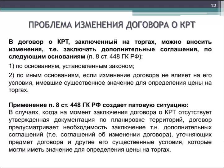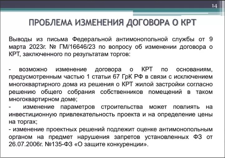 Затем он привел позицию ФАС по поводу изменений договора о КРТ: