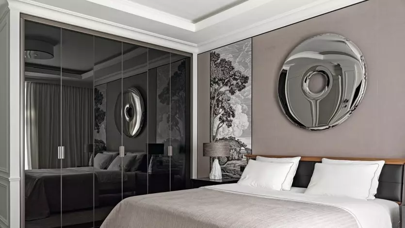 По индивидуальным эскизам для квартиры были изготовлены мраморные порталы декоративных каминов, лаконичные чёрные комоды и книжный стеллаж для кабинета. В спальне стены украшают декоративные панно в духе гравюр Томаса Гейнсборо, выполненные вручную, а над изголовьем кровати размещён арт-объект из полированной стали. Особое место занимает библиотека хозяина с ценными изданиями, включая энциклопедию Брокгауза и Ефрона.