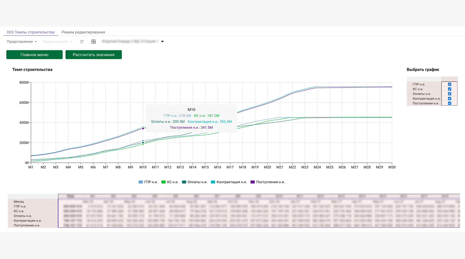 На графике ниже представлен нарастающий темп строительства по проекту: сопоставляются целевой и фактический/прогнозный объем работ, отражается оплата, контрактация и поступление средств. Руководство оперативно видит отклонения от плана, оценивает финансовый баланс проекта и своевременно принимает управленческие решения.