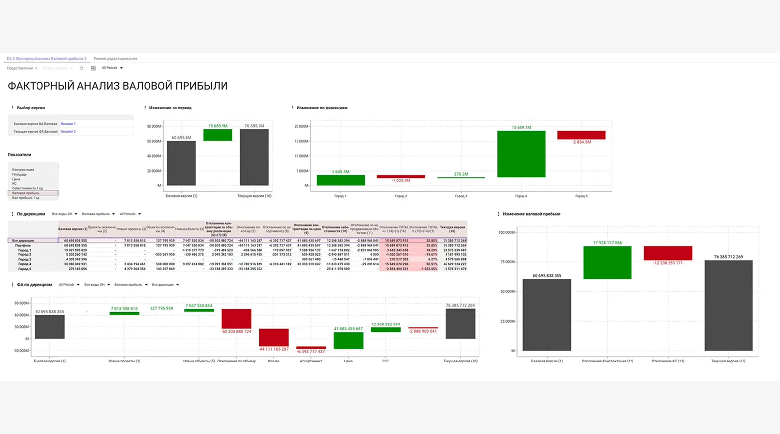 На отдельном дашборде проводится автоматическая декомпозиция отклонений валовой прибыли, разделяется влияние цен, объемов и себестоимости. Благодаря этому можно мгновенно определить, какой регион или фактор оказал решающее влияние на финансовый результат. Руководству это помогает контролировать маржинальность и оперативно корректировать стратегии реализации проектов.