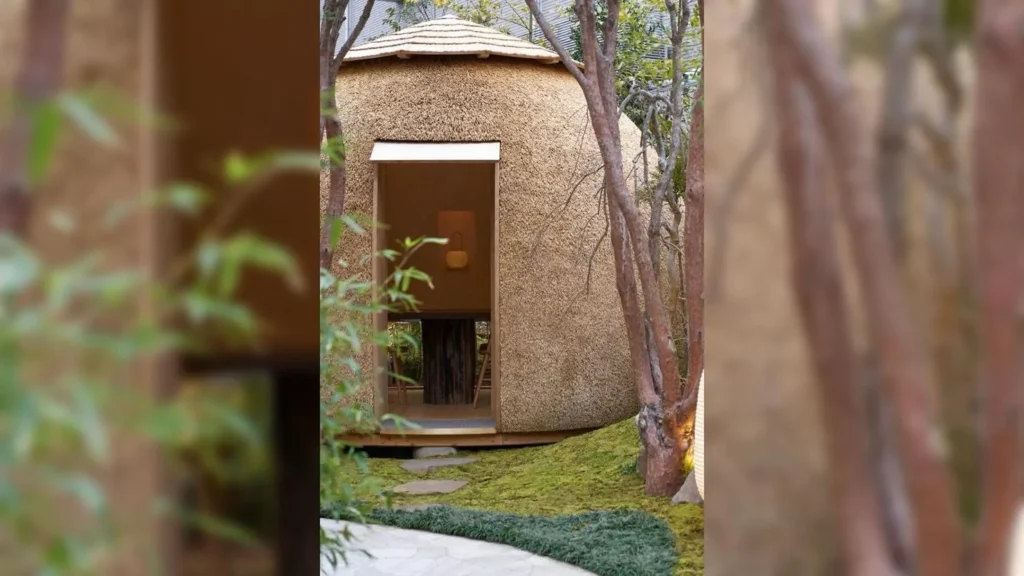Главный акцент здания — фасад, полностью облицованный бамбуком с золотым покрытием. Это решение одновременно декоративное и концептуальное. С точки зрения строительства важно отметить использование натурального материала с последующей обработкой, создание модульной фасадной системы, защиту от климатических воздействий, интеграцию подсветки. Бамбук выбран не случайно. В японской культуре он символизирует гибкость и устойчивость. В архитектуре это также легкий и прочный материал, который при правильной обработке может использоваться в сложных конструкциях. В вечернее время фасад работает как световой объект: подсветка подчеркивает текстуру и создает динамическую игру отражений. Общая площадь комплекса составляет около 1800 квадратных метров. Пространство разделено на несколько функциональных блоков: торговые залы, зоны отдыха, выставочные пространства, кафе, ландшафтные участки. Такое зонирование позволяет увеличить время пребывания посетителей и расширить сценарии использования объекта.