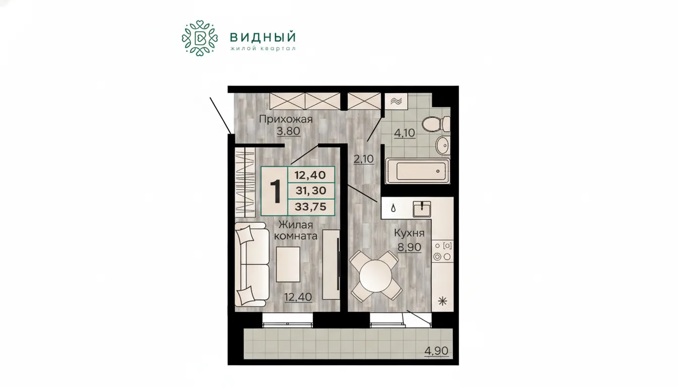 1-комнатная квартира в ЖК «Видный», 4 974 750 ₽