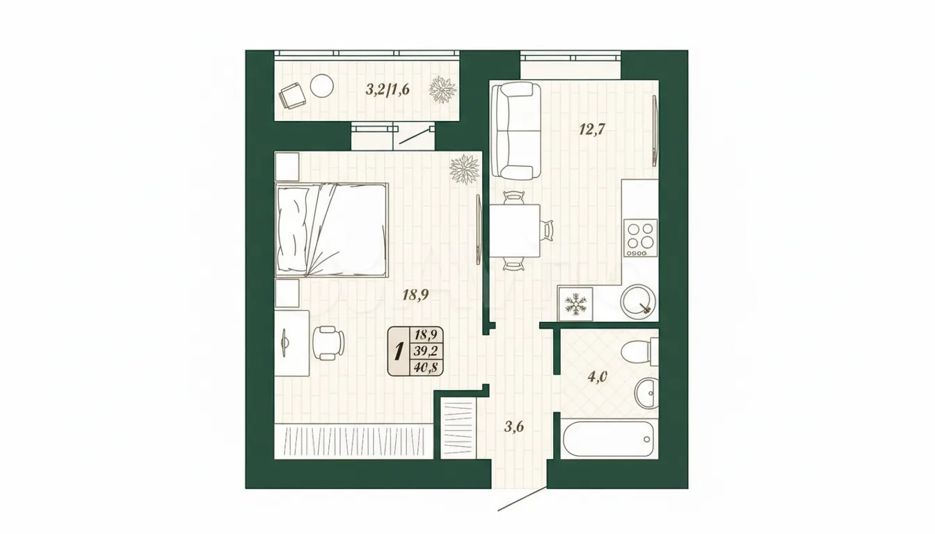 | Площадь | 39,2 м² (жилая 18,9 м²) |