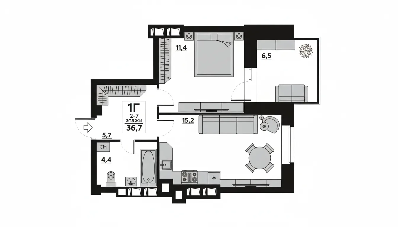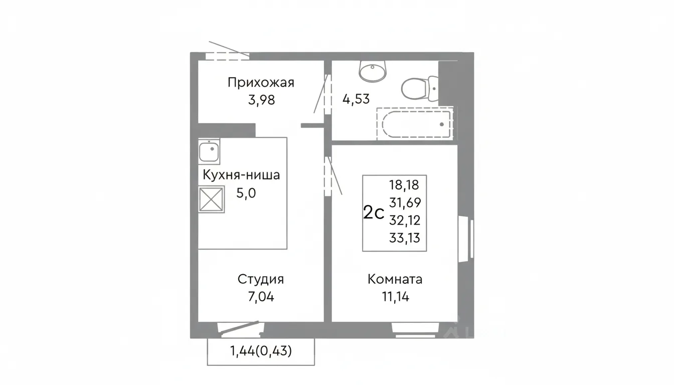 | Площадь | 33,75 м² (жилая 12,4 м²) |