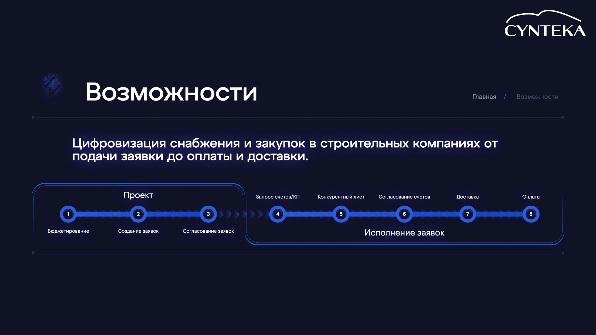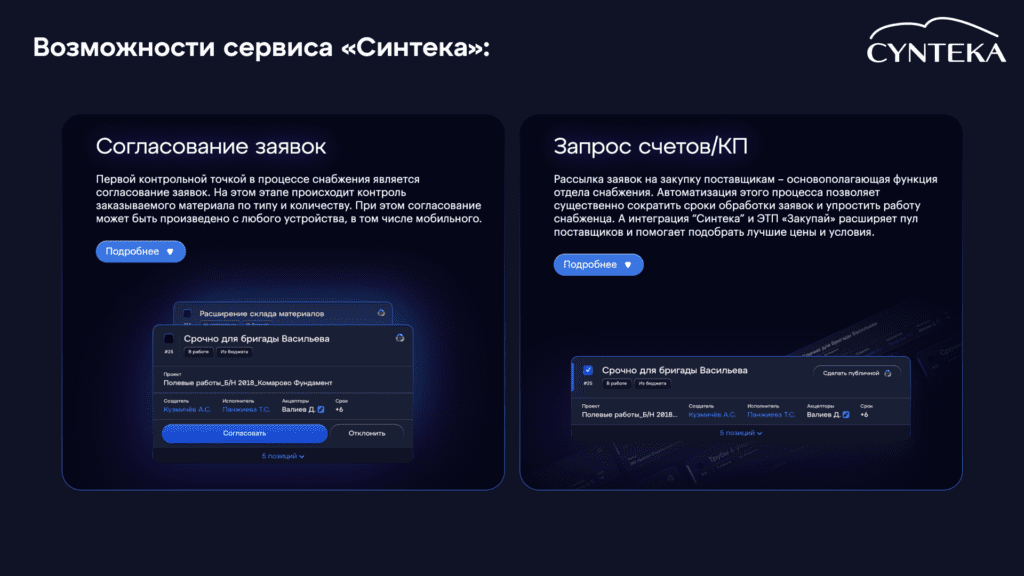Цифровизовать весь процесс закупок от подачи заявки до оплаты и доставки и вывести работу отдела снабжения на новый уровень можно с помощью сервиса «Синтека».