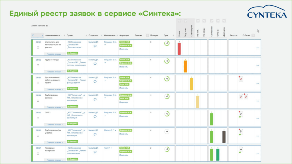 Таким образом, программа для автоматизации службы снабжения в строительной компании «Синтека» помогает синхронизировать работу офисных сотрудников отдела снабжения и строителей на площадке. Сервис избавляет и снабженцев, и подрядчиков на стройке от рутинной работы, а руководству дает возможность контролировать работу отдела закупок.