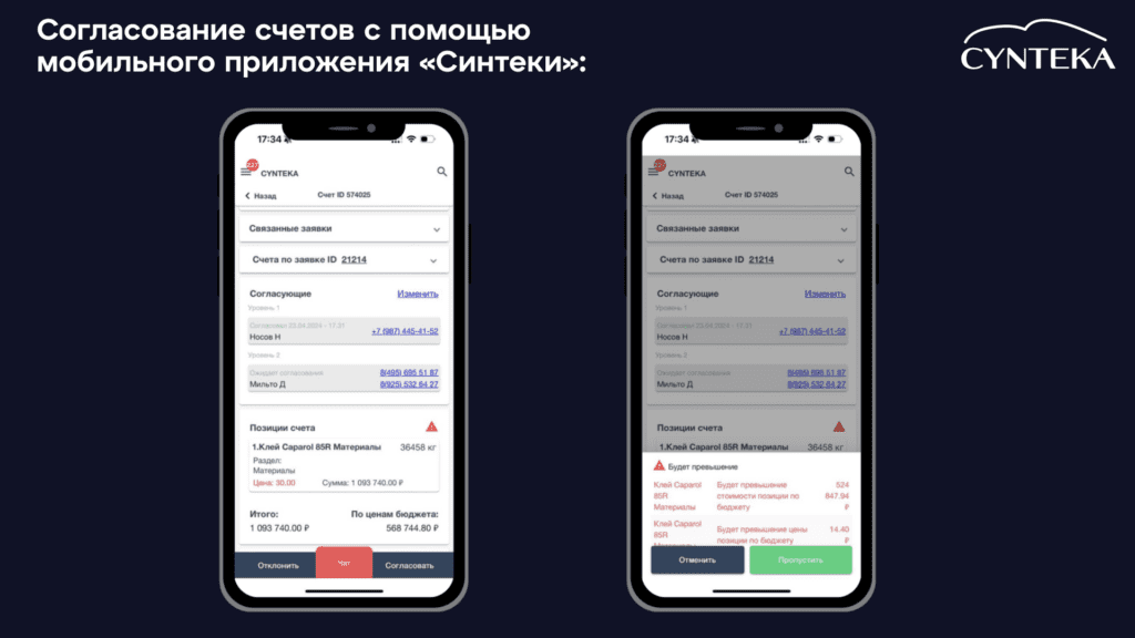 Еще одно из преимуществ сервиса «Синтека» в том, что он помогает контролировать закупку на этапе и согласования заявок, и счетов. В момент формирования заявок программа автоматически сверяет заказываемый материал по типу и количеству, проверяя, соответствуют ли они планам. На этапе согласования счетов происходит контроль приобретаемого материала еще и по цене, заложенной в бюджет, чтобы избежать не только ненужных покупок, но и перерасходов.