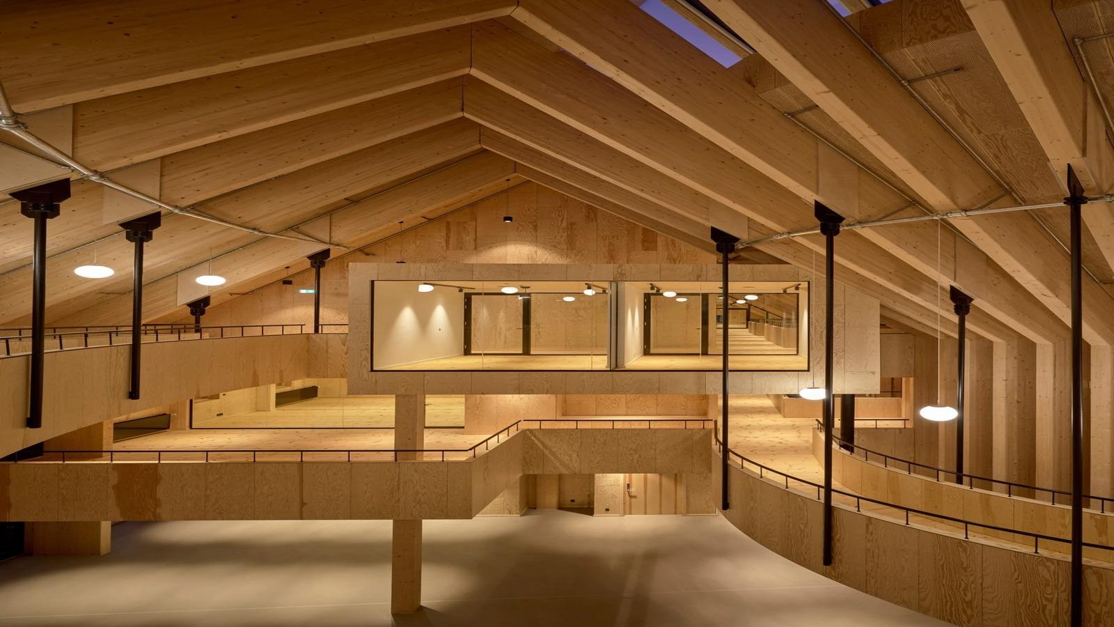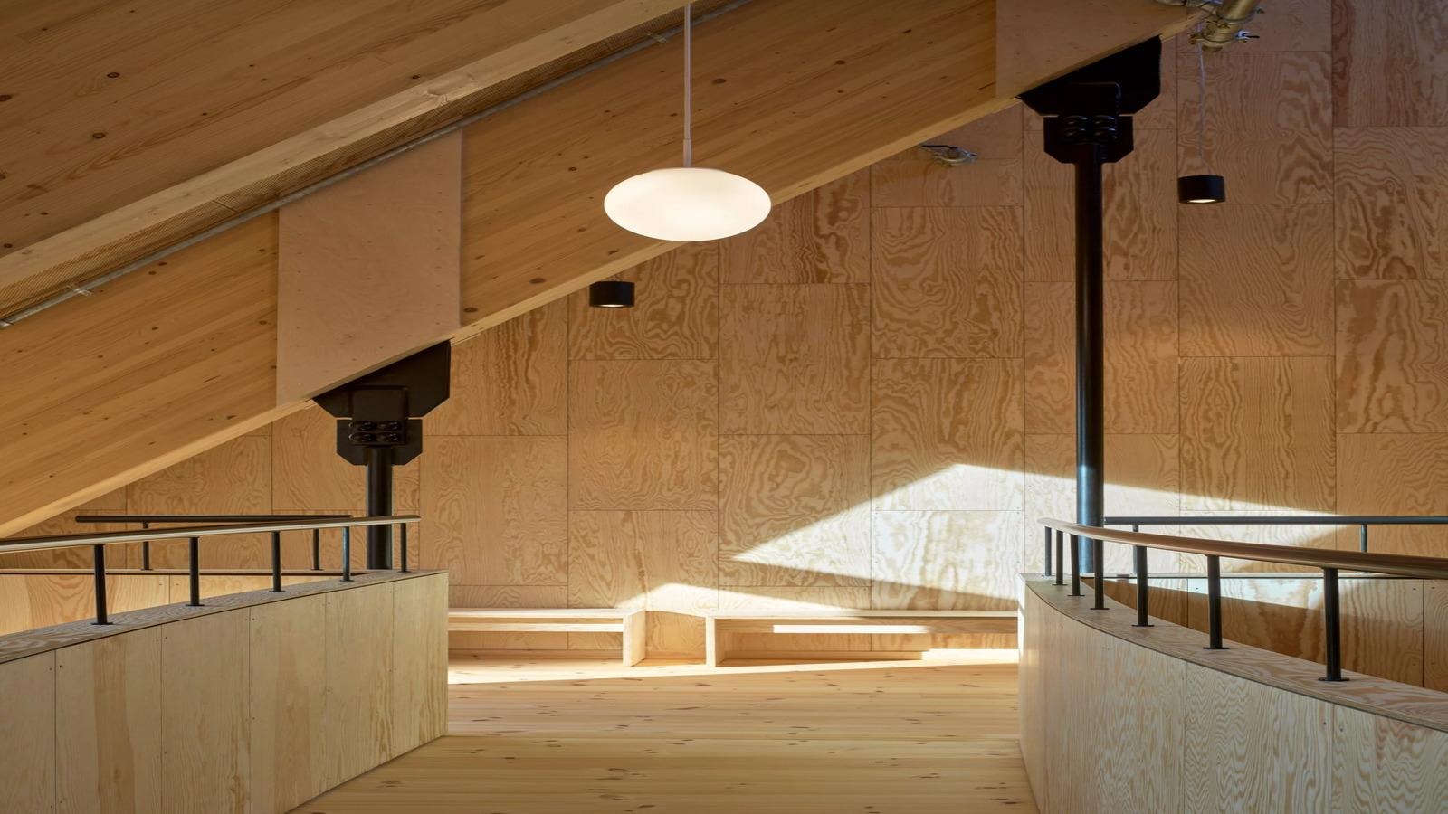 Внутреннее пространство центра полностью выполнено из дерева. Несущие конструкции собраны из клееного бруса, а для отделки стен, потолков и встроенной мебели использована сосновая фанера. Такой выбор материалов был принципиальным.