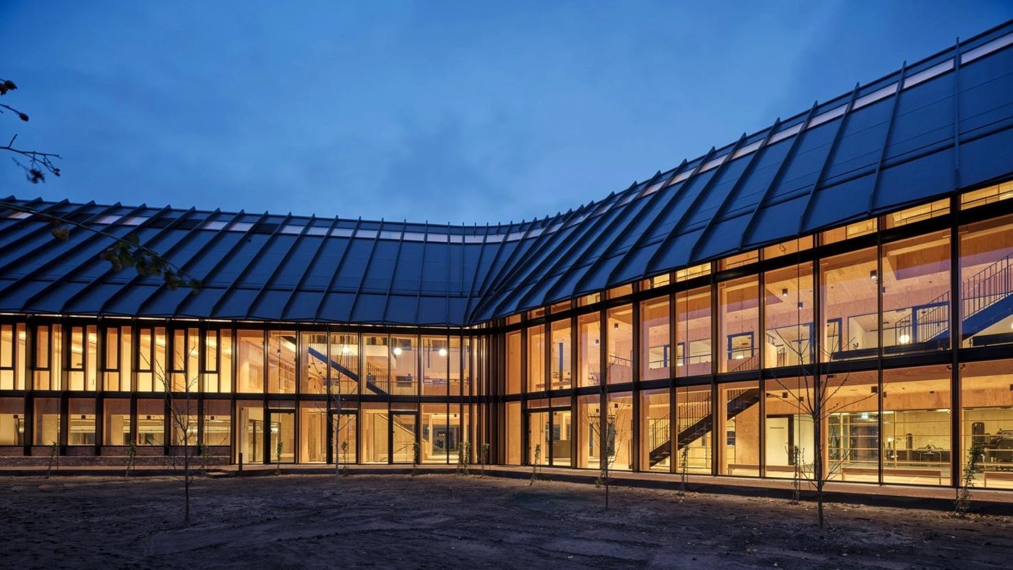 Крыша не только формирует узнаваемый силуэт, но и выполняет важную функциональную роль. На ней размещены солнечные панели общей площадью около 164 квадратных метров, что подчеркивает устойчивый и экологически ответственный характер проекта.