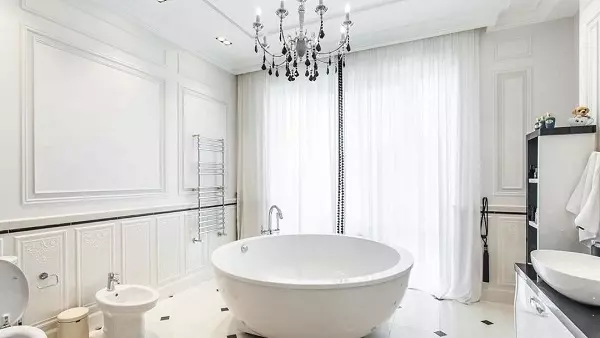 Ванная комнаты выполнена в белоснежных тонах с контрастными черными акцентами. Главный элемент — большая, отдельно стоящая ванна круглой формы. Дизайн дополняют классические молдинги на стенах, хрустальная люстра и позолоченные детали.