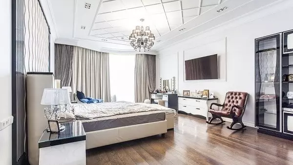 Спальня также оформлена в светлых тонах с использованием классических элементов. Здесь находится большая кровать, туалетный столик с зеркалом и удобное кресло-качалка. Стены украшены рельефными панелями, а окно декорировано плотными и легкими шторами.
