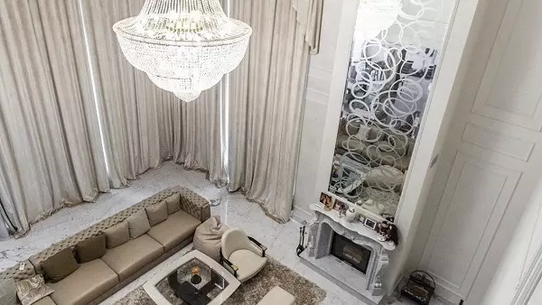 Гостиная представляет собой просторную комнату с высокими потолками. Особое внимание привлекает массивная хрустальная люстра, которая придает интерьеру изысканность. Камин, отделанный мрамором, служит центральным элементом, создавая уютную атмосферу.