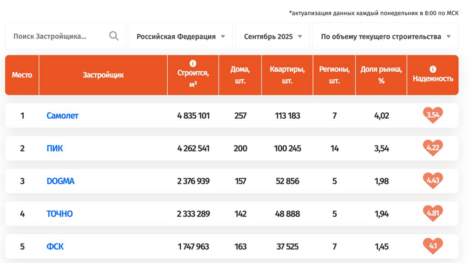 Месяц назад компания была на 4-й строчке нашего рейтинга, возводя в России 1,966 млн «квадратов» жилой недвижимости. Теперь же девелопер строит 2,377 млн, обогнав по этому показателю ГК ТОЧНО.