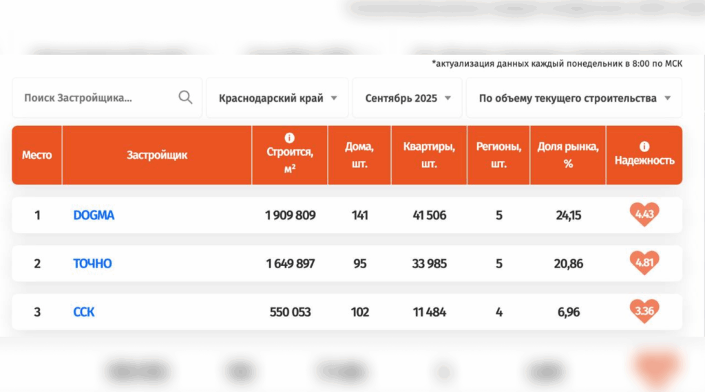 В Краснодарском крае DOGMA стала лидером региона по объему текущего строительства жилья, также опередив коллег из ГК ТОЧНО и выйдя на 1-е место с 1,9 млн кв.м. — на 351 тыс. больше, чем месяц назад.