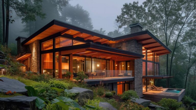 Несмотря на масштаб современного здания, участок сохранил природный характер. Здесь нет традиционных огородов или плотной застройки — вместо этого оставлен лесной массив, дополненный аккуратным газоном и цветами. Такое решение подчеркивает идею жизни «внутри природы», а не рядом с ней.