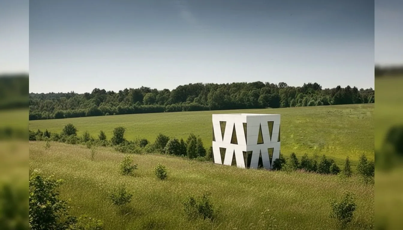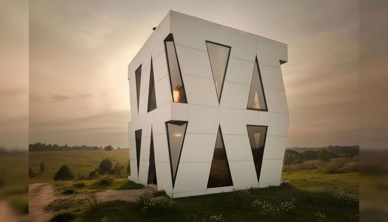 Главная особенность дома — его форма. В основе лежит кубическая конструкция, пронизанная сложной геометрией. Внешне здание напоминает арт-объект: 24 треугольных проёма формируют необычный фасад, который меняется в зависимости от освещения и времени суток. Практически все проёмы заполнены зеркальными окнами, и лишь один из них выполняет функцию входа. Такое решение не только усиливает визуальный эффект, но и обеспечивает приватность: днём дом отражает окружающий ландшафт, становясь почти невидимым, а ночью превращается в светящийся объект. Каждое окно — это массивная конструкция весом около 150 килограммов. Использование энергоэффективных профильных систем позволило добиться высокого уровня теплоизоляции, что особенно важно для автономного жилья.