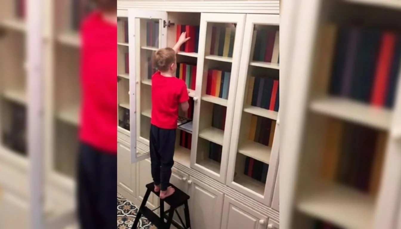 Интересно, что гостиная практически сливается с прихожей. Фактически это единое пространство, где функциональность превыше всего: плитка на полу, зоны хранения, огромный книжный стеллаж и шкаф для верхней одежды. Такой подход экономит пространство и делает интерьер одновременно комфортным и практичным.