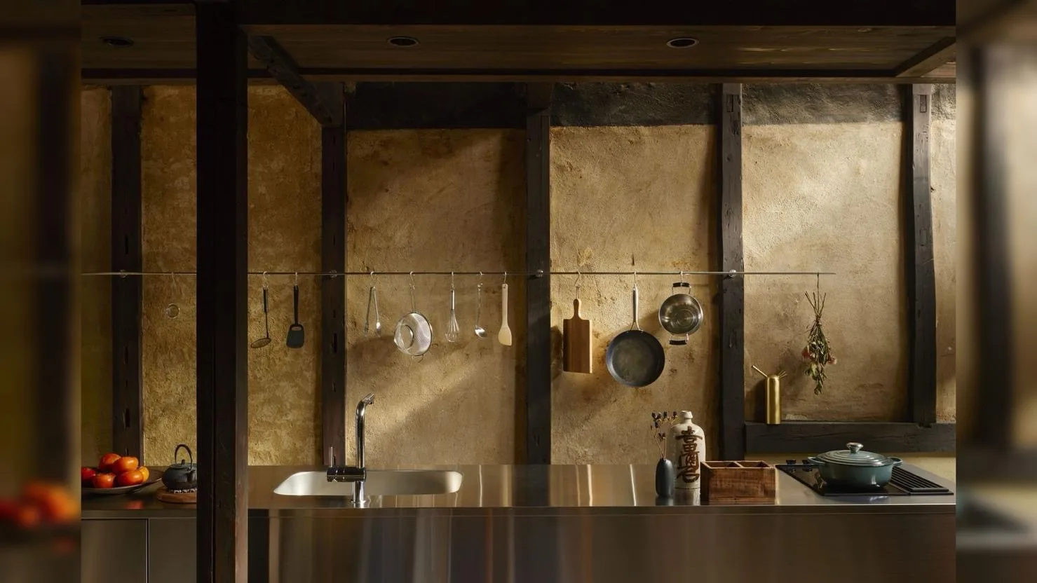 Центральным элементом дома стала кухня. Это не просто функциональная зона, а настоящее ядро всего пространства. Здесь установлен четырехметровый остров из нержавеющей стали, выполненный мастерской Konbu Brothers. Для этой мастерской проект стал крупнейшим частным заказом в их практике. Над рабочей поверхностью закреплён металлический держатель, на котором размещены кухонные принадлежности — кастрюли и половники, превращенные в часть композиции.