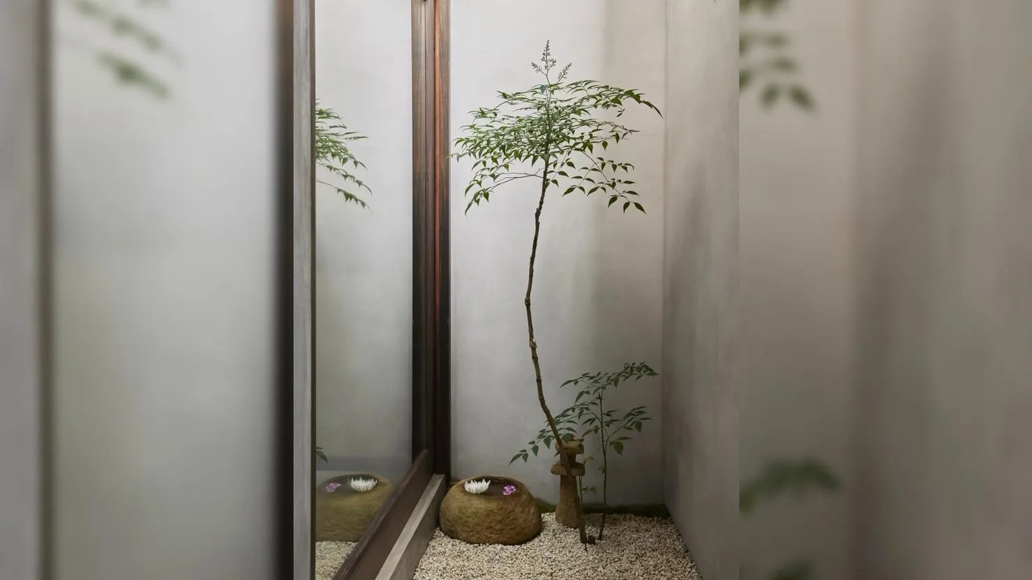 Переход к ванной комнате организован через небольшой сад. Здесь высажено карликовое дерево нантен, установлена каменная башенка и чаша для воды, выполненные мастерами из Тоттори. Этот путь превращает повседневное действие в медитативный ритуал, усиливая связь с природой.