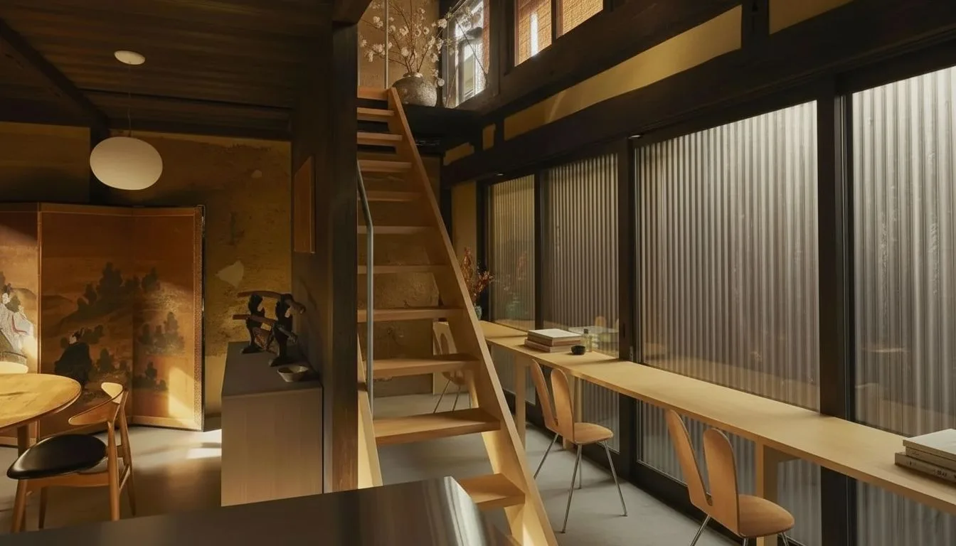 В интерьере органично переплетаются разные эпохи японской и мировой культуры. На старинных комодах соседствуют мечи эпохи Камакура и периода Эдо, а на стенах размещены произведения современного искусства, включая работы художницы Акико Кондо. Особое место занимает тарелка эпохи Хэйан, восстановленная в технике кинцуги, где трещины подчеркиваются золотом, превращая повреждение в декоративный элемент.