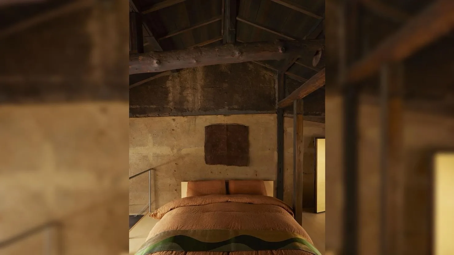 Спальня расположена на антресольном уровне и представляет собой максимально спокойное пространство. Кровать и шкаф выполнены из японского кипариса местными плотниками, что обеспечивает не только визуальную легкость, но и характерный аромат древесины. Над кроватью размещена ткань, окрашенная по традиционной технологии с использованием хурмы. Она даёт мягкий оранжевый оттенок и создаёт тёплую атмосферу.