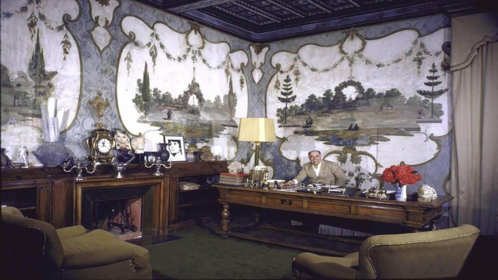 Особое место занимал рабочий кабинет Карло Понти. На архивных кадрах он запечатлен за письменным столом, окруженный книгами, документами, кинематографическими материалами. Кабинет был строгим, почти аскетичным — контрастом к более мягким жилым пространствам.