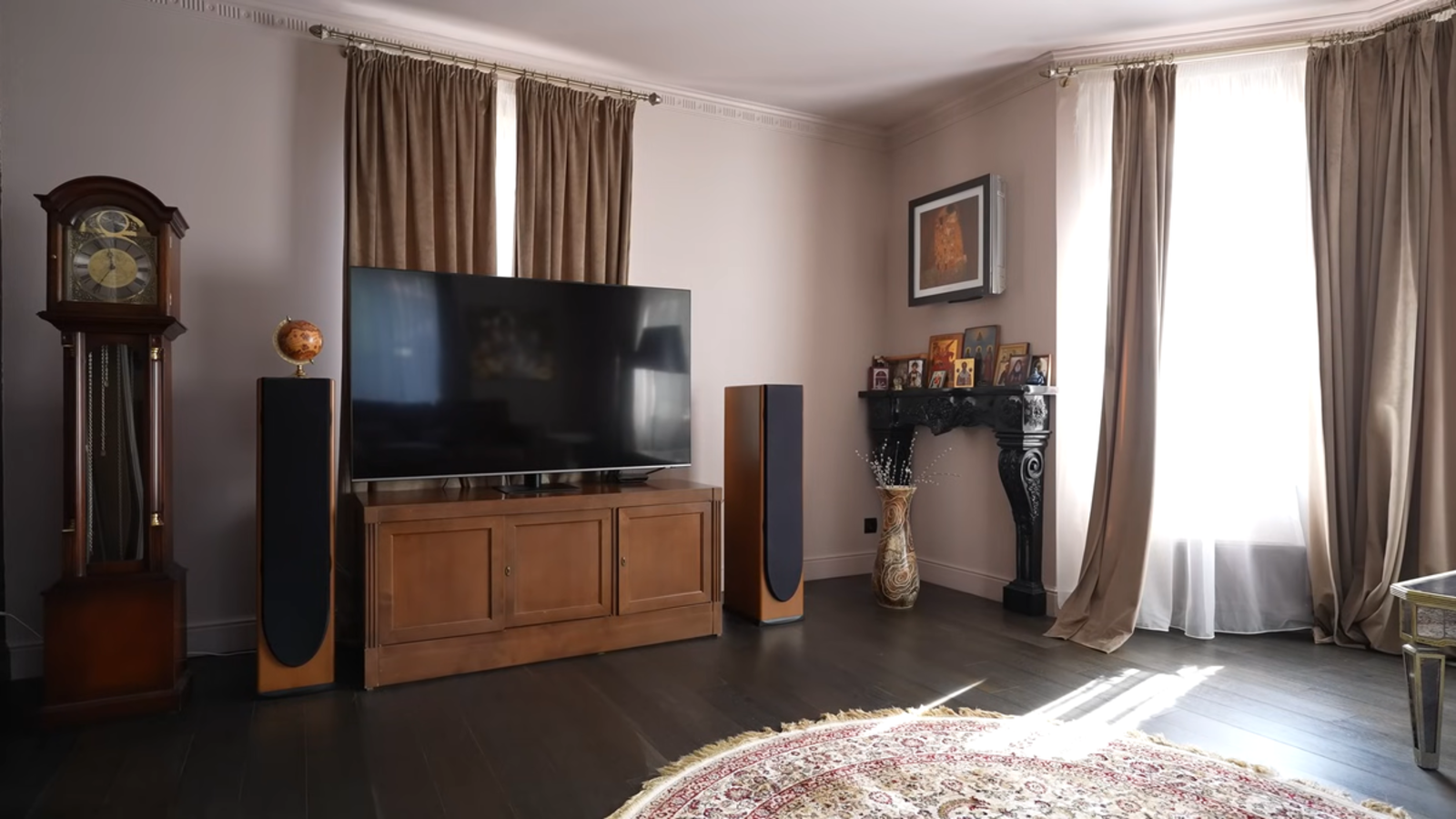 В гостиной внимание зрителей привлекает соседство икон, буддийских статуэток, свечей и восточных мотивов. Формально это можно было бы назвать эклектикой, но на практике элементы не вступают в диалог друг с другом. Они как бы существуют параллельно, создавая ощущение визуального шума.