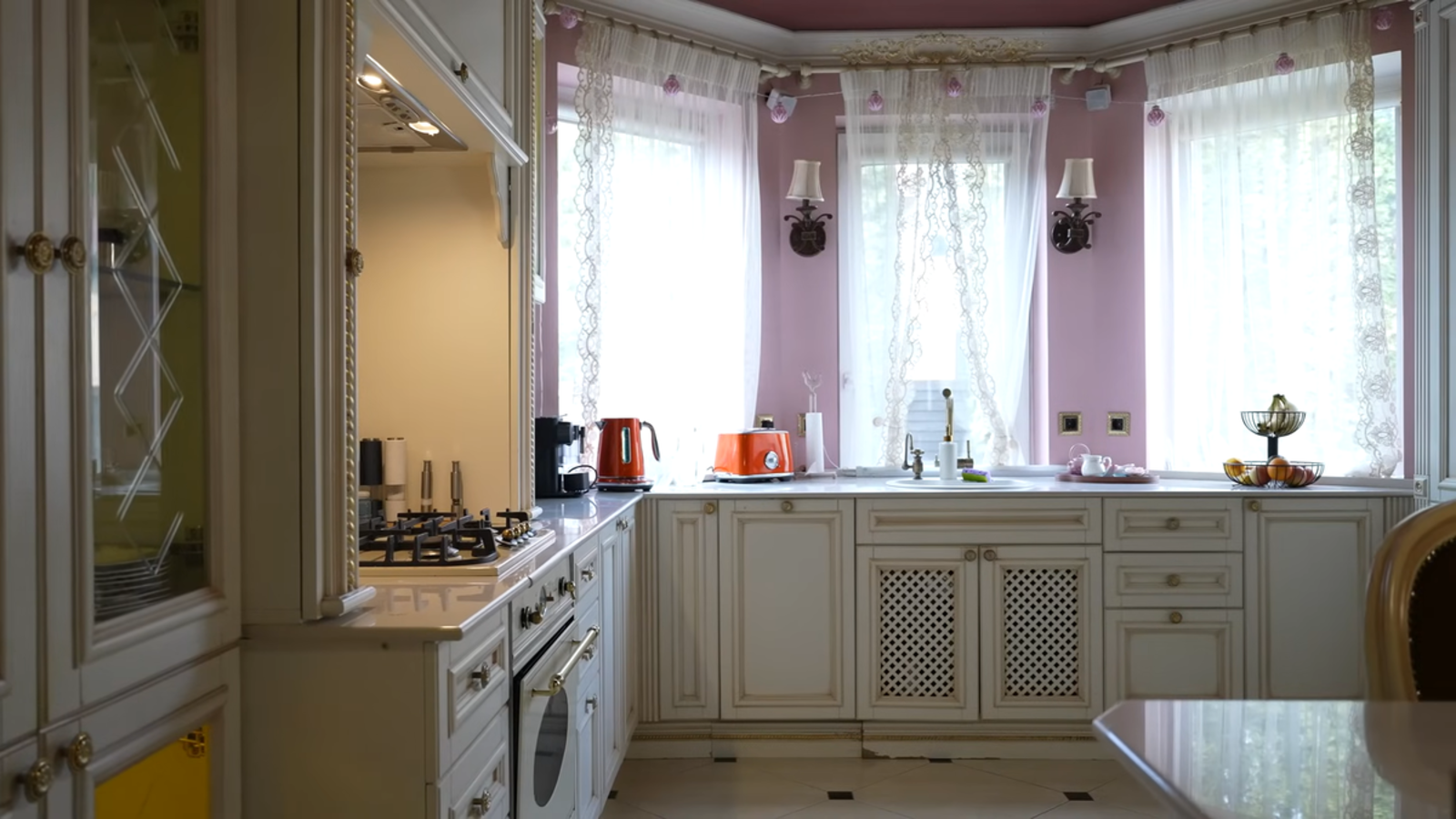 Кухонный остров с массивной каменной столешницей становится отдельным объектом обсуждения. Он подаётся как символ гостеприимства и изобилия — место для больших застолий, приёма гостей, демонстрации достатка. Однако в кадре эта «витрина достатка» смотрится скорее как декларация, чем как часть реально используемой среды.