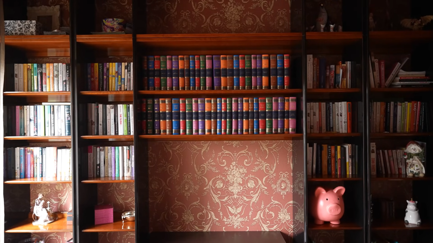 Однако визуально библиотека производит впечатление скорее подарочного собрания, чем активно используемого пространства. Книги выглядят нетронутыми, а сама зона — больше как элемент статуса, чем как отражение повседневной интеллектуальной работы.