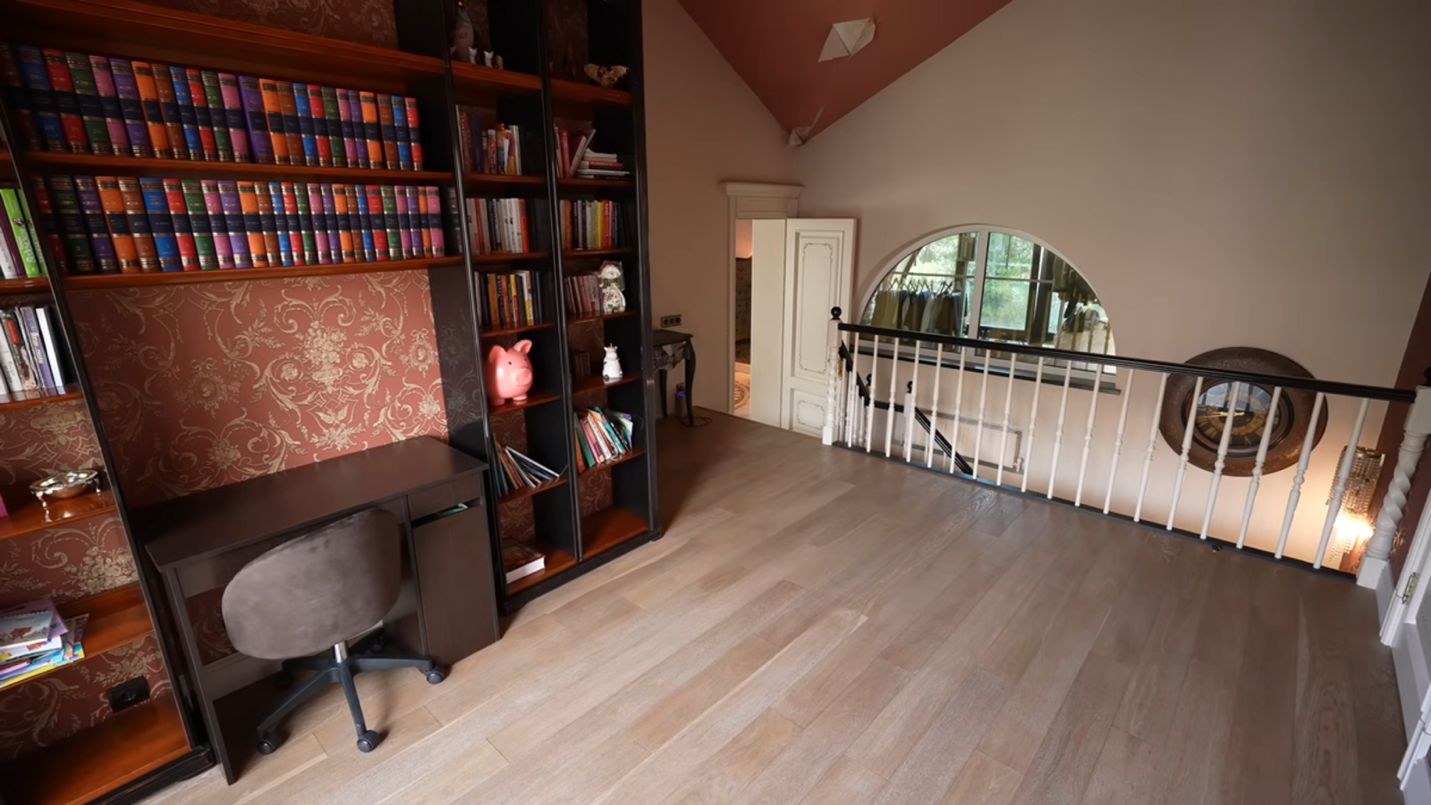 На втором уровне дома расположен холл с библиотекой. Полки заставлены классическими произведениями, философией, психологией, восточными трактатами. Звучат имена, которые традиционно ассоциируются с «культурным капиталом».