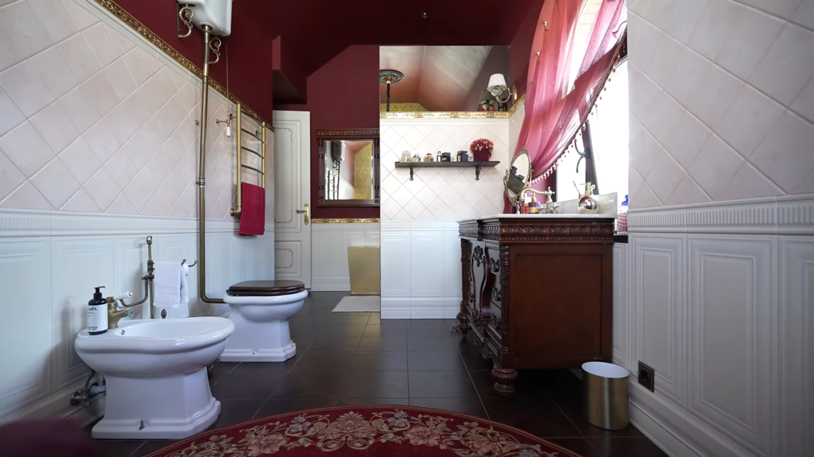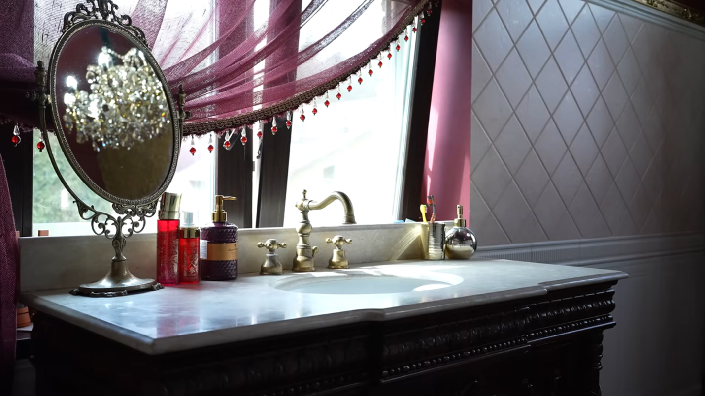 Кульминацией экскурсии становится признание хозяйки: самым любимым помещением в доме она называет туалетную комнату. Пространство оформлено в насыщенных бордовых оттенках, с антикварной мебелью, этническими деталями, декоративными элементами ручной работы.