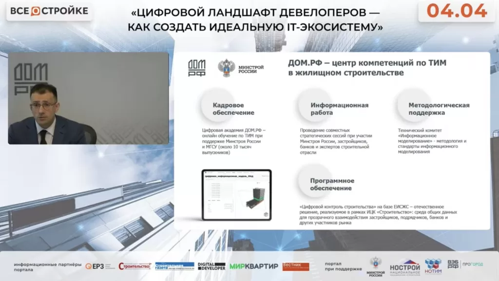 Управляющий директор по ИТ и цифровизации ДОМ.РФ Николай Козак также рассказал о ходе цифровизации строительной отрасли.