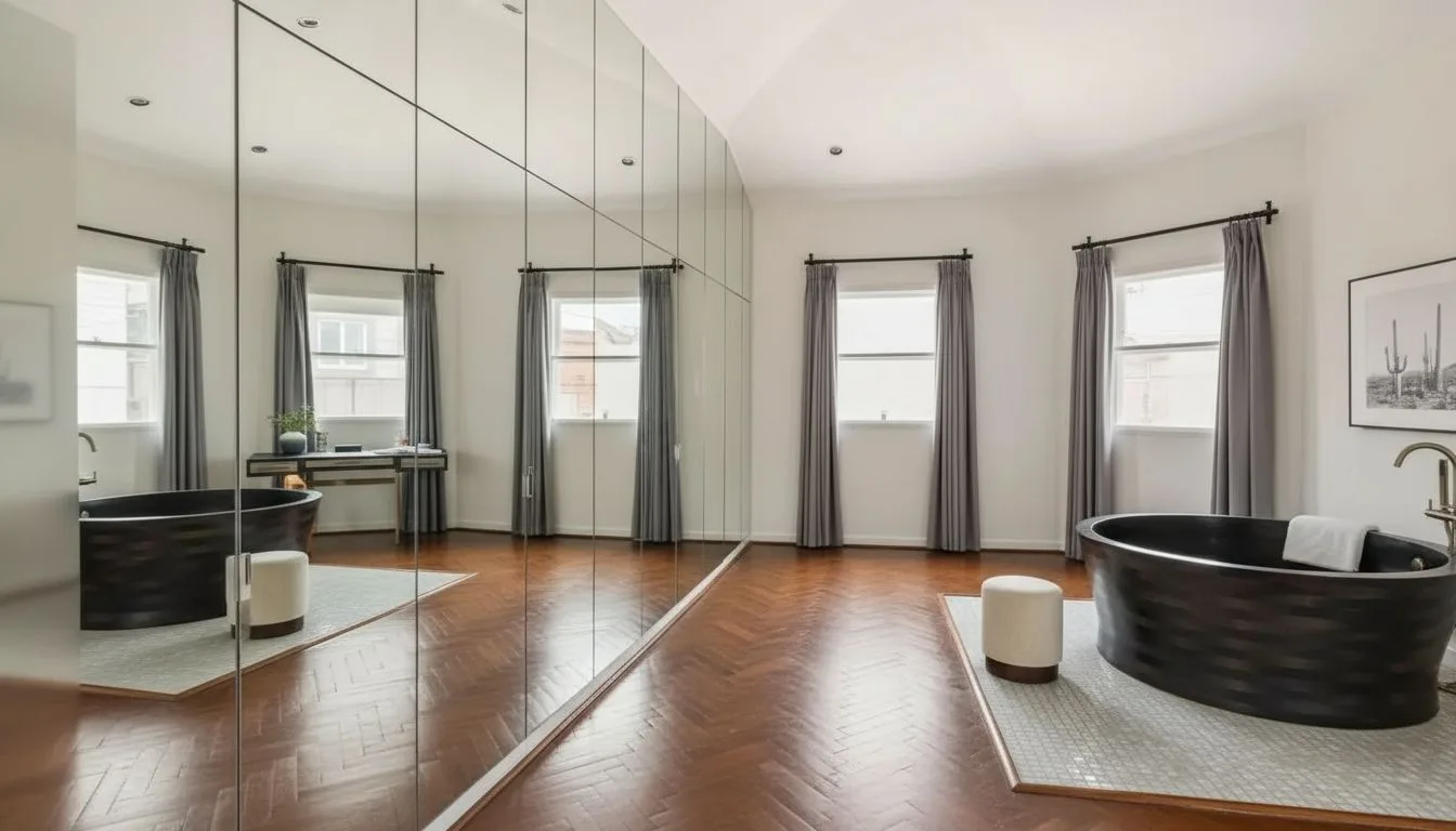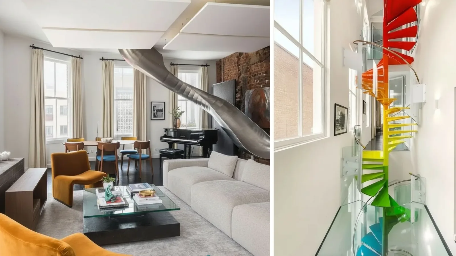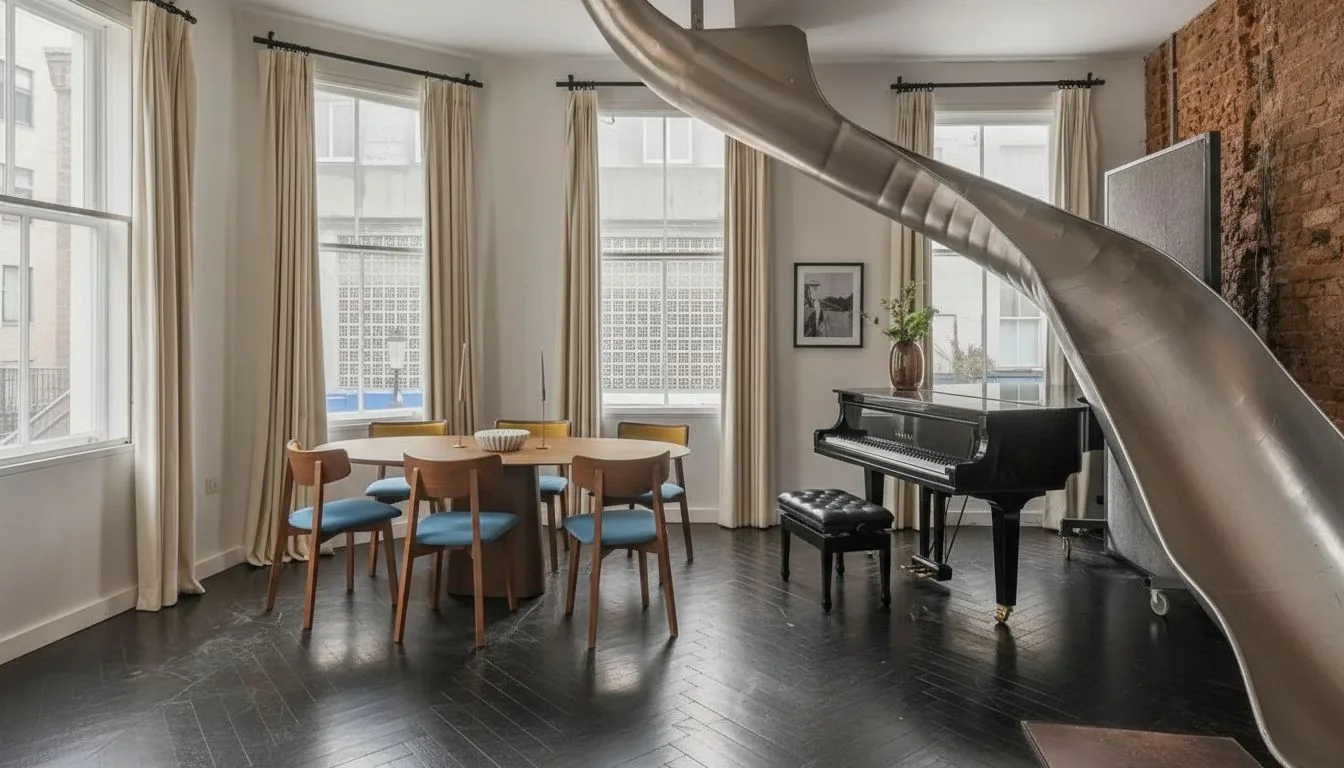 Интерьеры дома сложно назвать типичными даже для премиального сегмента. Они выполнены в стиле, который можно описать как индустриальный ретро с элементами арт-дизайна. Пространство напоминает старый склад, но переосмысленный с точки зрения современного комфорта. Здесь нет классической симметрии и стандартных решений — наоборот, каждая зона выглядит как самостоятельный арт-объект. Среди самых необычных элементов: лестница с эффектом калейдоскопа, создающая визуальную динамику, зеркальные встроенные шкафы в главной спальне, металлическая горка, соединяющая второй этаж с гостиной. Последний элемент особенно показателен: он превращает дом из просто жилого пространства в интерактивную среду, где архитектура становится частью опыта.