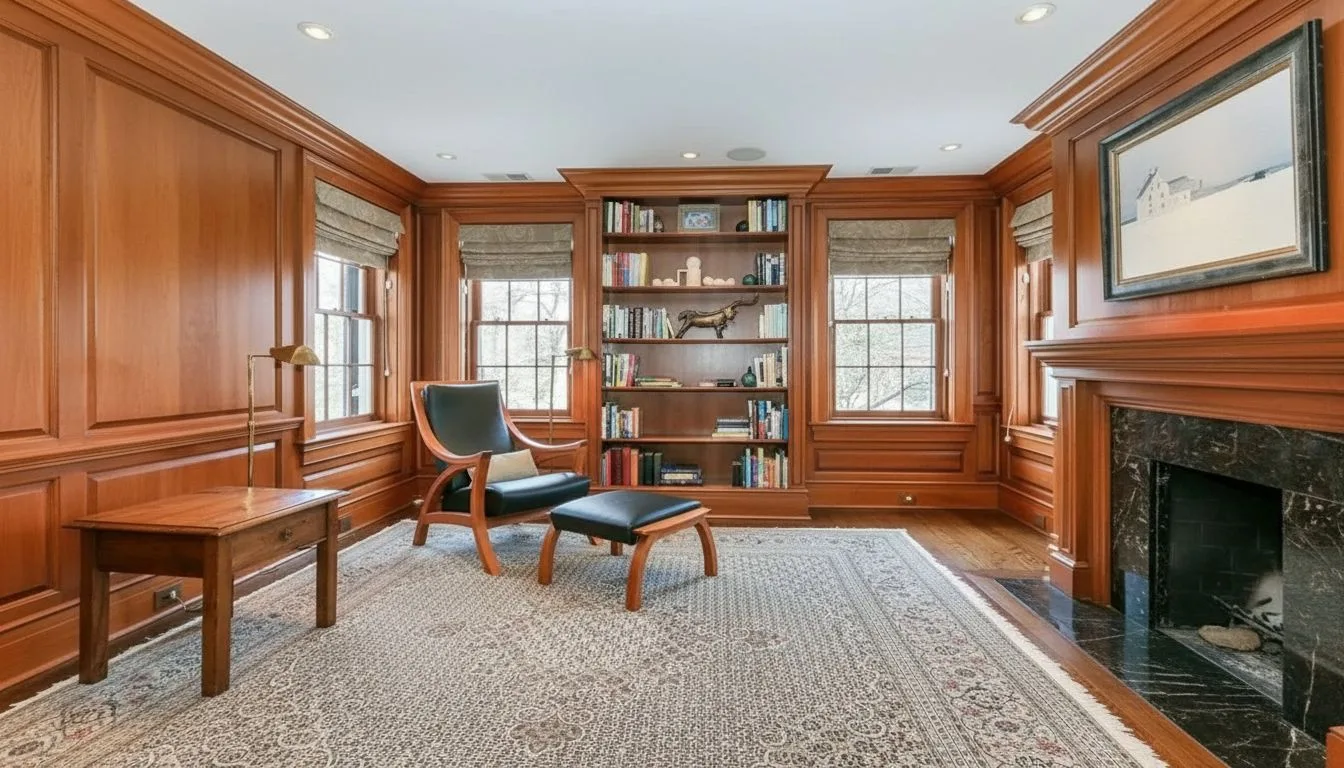 Большая часть жилых помещений отведена под спальни и кабинет. В доме есть отдельная библиотека со встроенными книжными полками — пространство, которое особенно ценят коллекционеры и любители классической архитектуры.