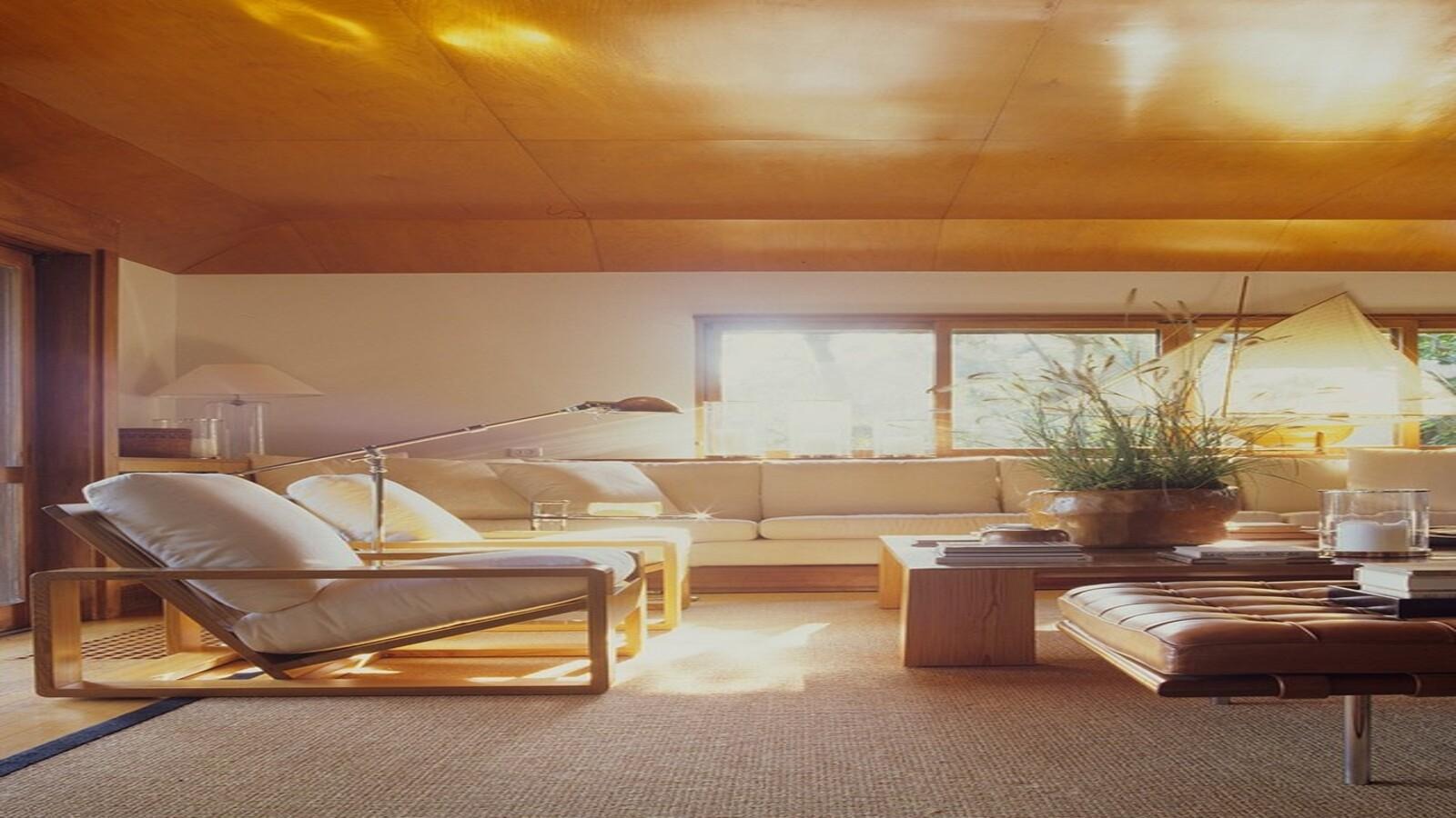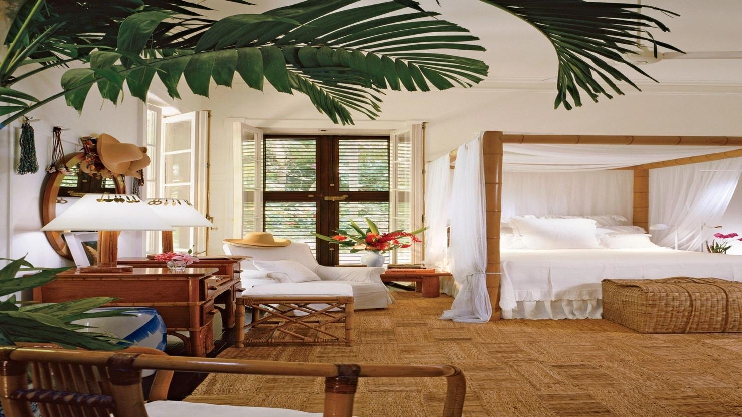 Здесь дизайнер отказался от насыщенных цветов и сложных форм. Интерьер построен на белом цвете и натуральных материалах: дерево, хлопок, лен, циновки вместо ковров. Пространство кажется почти невесомым, наполненным воздухом и светом.