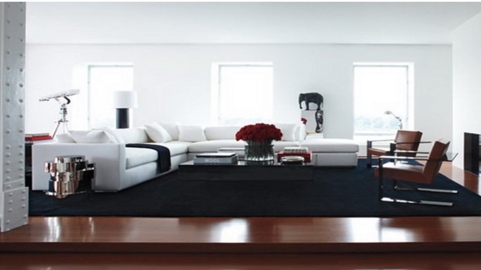 Высокие окна не закрыты плотными шторами — дизайнер стремился сохранить эффект «парения» над городом. В этом доме Лорен использовал преимущественно предметы из собственной коллекции, превратив квартиру в образцовый пример современной линии Ralph Lauren Home.