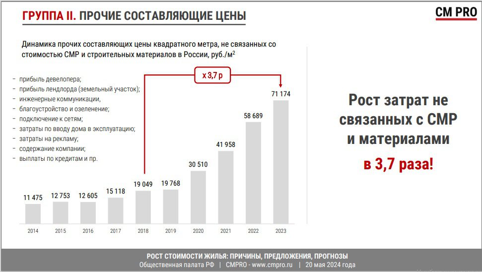 Впрочем, в цену метра застройщики закладывают не только фактическую стоимость строительства, но и прочие расходы, не связанные со строительно-монтажными работами и материалами. Это прибыль девелопера и лендлорда (землевадельца), затраты на подведение инженерных коммуникаций, озеленение, благоустройство, подключение к сетям, расходы на этапе ввода дома, рекламу и в целом содержание компании, выплаты по кредитам и прочее. И динамика этих составляющих цены метра показала рост в 3,7 раза (с 19 049 рублей за кв. метр в 2018 году до 71 174 рублей за кв. метр в 2023 году).