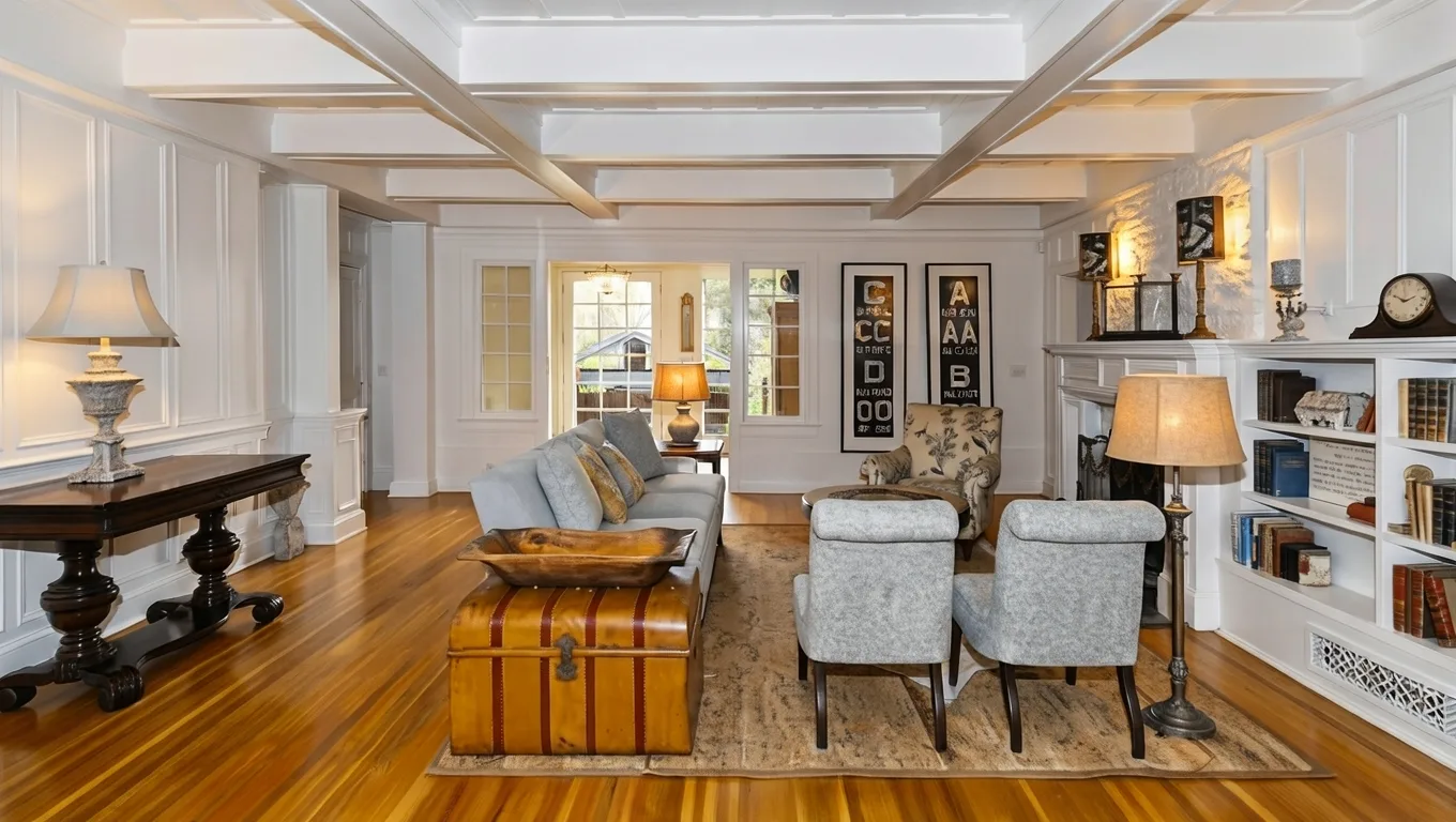 Гостиная выдержана в белых тонах. Полки и камин — снежного цвета. На этом нейтральном фоне выделяется мебель натурального дерева.