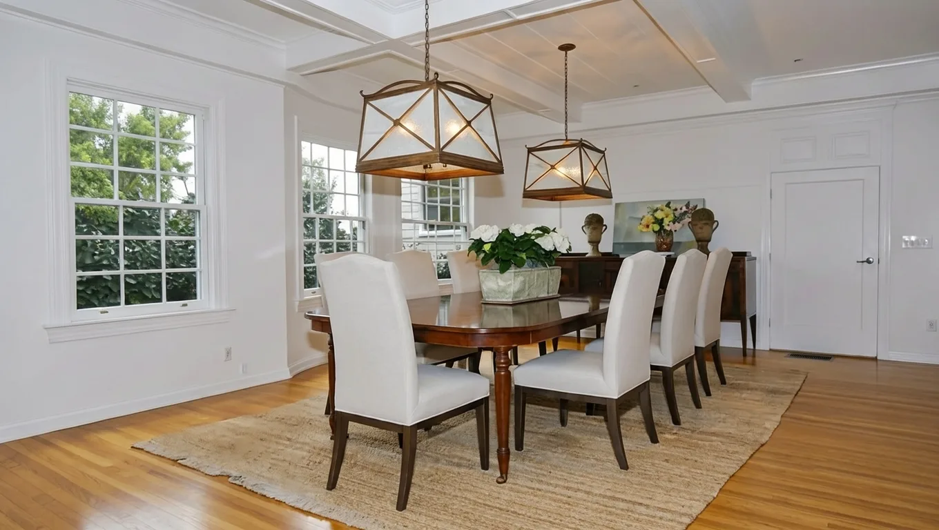 Маленький журнальный столик и большой обеденный стол — тоже из натурального дерева.