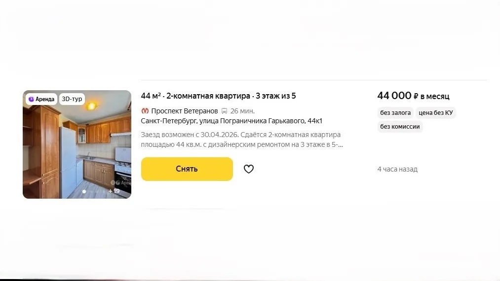 При этом средние цены по городу остаются довольно высокими. По разным оценкам, средняя ставка аренды в Петербурге колеблется в районе 42 000–48 000 рублей. Это значит, что все, что заметно ниже этой планки, уже можно считать бюджетным сегментом. На апрель 2026 года студию можно снять в среднем за 33 000 рублей, а однушку — за 41 500 рублей.