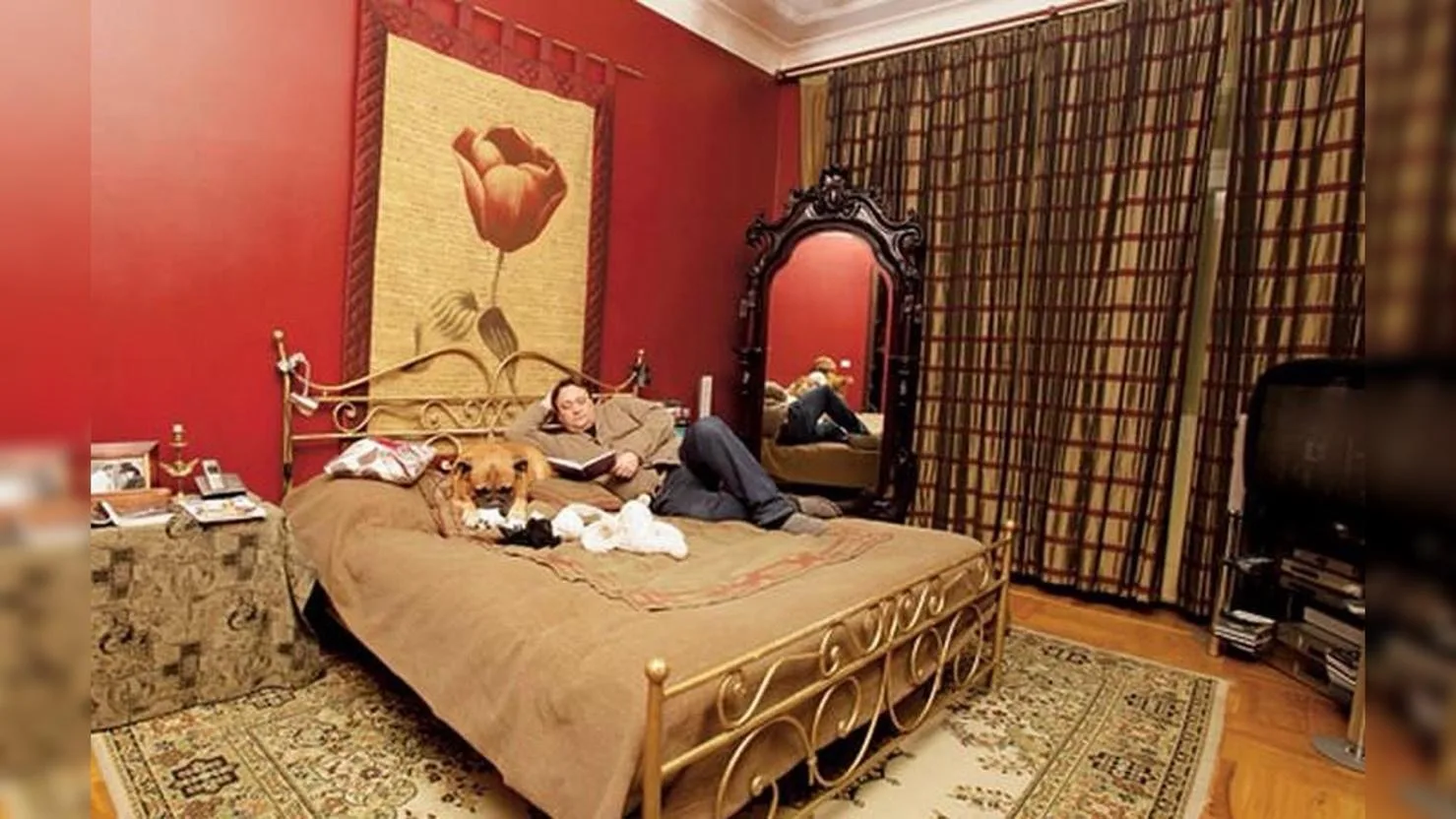 Хозяйская спальня — это отдельная история. Стены выкрашены в глубокий красный цвет, а текстиль подобран в бежевых и темно-коричневых тонах. Центральное место занимает двуспальная кровать, над которой висит тканый гобелен соломенного цвета. Рядом — большое зеркало в массивном обрамлении. Всё это создаёт ощущение роскоши, но без пафоса — уютно и по-домашнему.