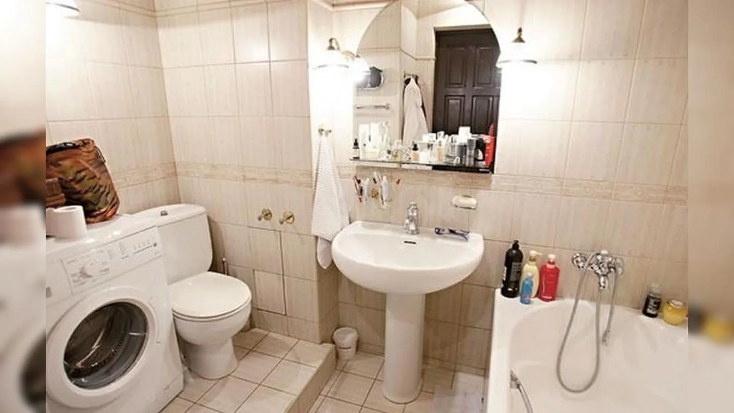 Ванная комната в квартире Клюквина полностью отделана плиткой молочного цвета. Этот выбор не случаен: светлая отделка контрастирует с насыщенными оттенками жилых комнат, а светло-бежевые стены и пол смягчают строгость белоснежной сантехники. Здесь всё продумано до мелочей — от цвета плитки до освещения, создающего ощущение свежести и чистоты.