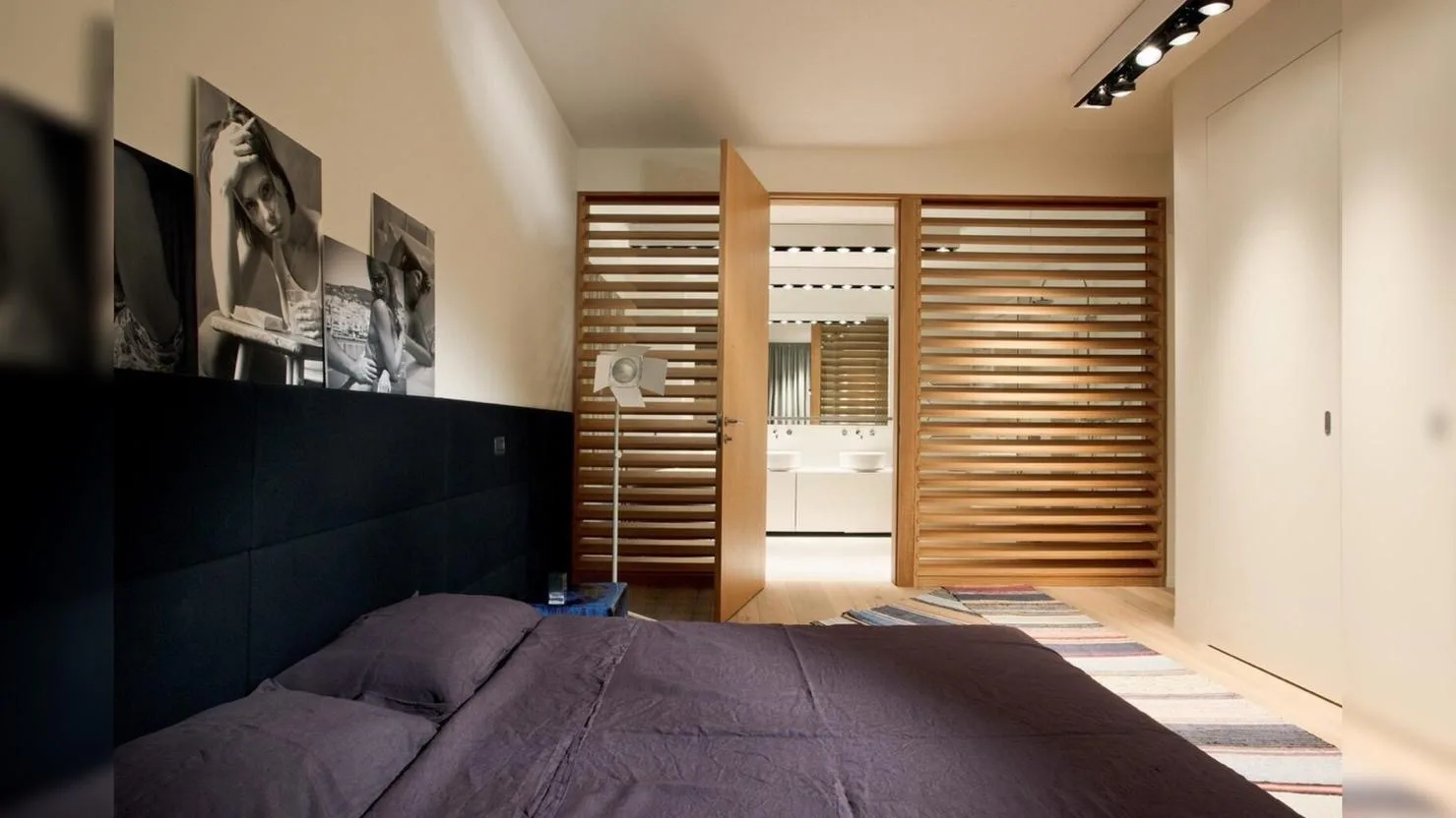 Особого внимания заслуживает организация спальни. В отличие от классических решений, здесь нет полноценной изоляции. Пространство отделено лишь перегородкой из деревянных жалюзи. Такой прием создает ощущение уединения, не лишая комнату света и воздуха. Внутри спальня оформлена максимально лаконично: кровать, прикроватная тумба и несколько декоративных элементов. Отсутствие лишних деталей подчеркивает функциональность и спокойствие зоны отдыха.